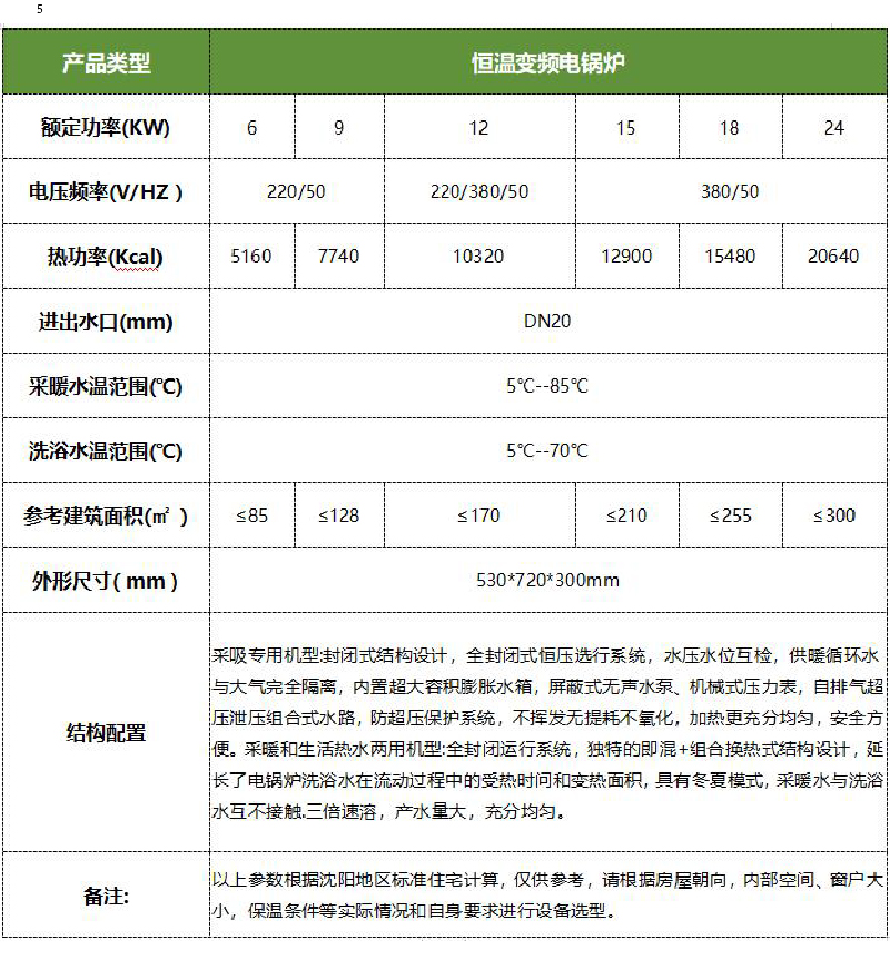 遠鵬恒溫變頻電采暖爐、采用數字模擬變頻技術、SPWM波形控制逆變電路系統、它包括條幅電源、觸發和整流模塊、輸出控制信號、觸發執行裝置等組成。加熱系統根據用戶設定的溫度自動調節輸出功率(1%-100%)、采暖水溫設定范圍5-85度、電壓變化時電功率恒定、全天候恒功率恒溫度運行、滿足高標準高品質采暖需要。